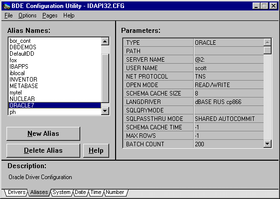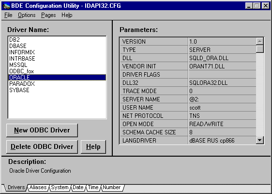 Рис. 6. Описание нового ODBC-драйвера "с точки зрения BDE". Отметим, что в версии BDE, поставляемой с Delphi 3.0, вся эта терминологическая путаница ликвидирована, а все описанные в реестре Windows источники данных добавляются в список псевдонимов, и тем самым ликвидируется необходимость выполнения описанной выше инструкции. Остается надеяться, что в следующей версии C++ Builder доступ к ODBC-источникам упростится таким же образом Для корректного отображения русских букв и установки правильного порядка алфавитной сортировки можно попытаться использовать какой-либо из русскоязычных драйверов dBase или Paradox. Однако следует помнить, что некоторые ODBC-драйверы имеют свои процедуры настройки, которые могут, в частности, включать опцию перекодировки OEM->ANSI (т.е. DOS->Windows). Кроме того, если доступ через ODBC осуществляется к какой-либо серверной СУБД, следует обратить внимание на возможности языковой настройки сервера и клиентской части. OracleДля настройки доступа к серверам Oracle следует настроить примерно тот же набор параметров, что и в случае ODBC-источников. Помимо этого, для драйвера ORACLE существует дополнительный набор параметров: