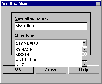 Рис. 3. Выбор псевдонима БД и установка параметров После этого в появившейся диалоговой панели следует ввести имя-псевдоним для этого источника и выбрать нужный драйвер из предложенного списка (того, что определен на странице Drivers). Имя STANDARD в этом случае соответствует таблицам dBase, Paradox и текстовым файлам (в формате CSV - Comma Separated Value).