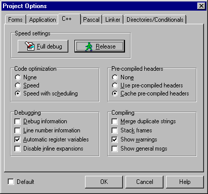 Рис. 1. Установка параметров компилятора C++ при окончательной сборке приложения. Если в проекте используются модули и формы Delphi, следует отключить все опции в секции Debugging и включить опцию Optimization в секции Code Generation на странице Pascal. В той же диалоговой панели следует выбрать пиктограмму приложения (страница Application). Eе можно создать с помощью входящего в комплект поставки С++ Builder графического редактора, который можно запустить, выбрав пункт меню Tools/image Editor. Помимо этого, следует указать название приложения (то есть строку, которая будет отображаться в панели задач Windows 95) и имя файла справки, в котором содержатся экраны контекстно-зависимой помощи. Более подробно о создании контекстно-зависимой помощи для приложений С++ Builder можно узнать в книге "Введение в Borland C++ Builder" (Н.Елманова, С.Кошель. - М.: Диалог-МИФИ, 1997).