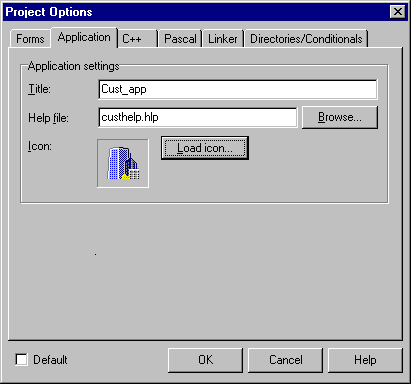 Рис. 2. Установка названия, пиктограммы и имени файла справки. Если ссылка на справочный файл присутствует в опциях проекта, можно связать экраны помощи с интерфейсными элементами приложения. Для этой цели следует установить значения свойства HelpContext интерфейсных элементов приложения равным номерам разделов соответствующих экранов помощи из секции [MAP] файла проекта справки. В этом случае после компиляции приложения нажатие на клавишу F1 будет выводить на экран окно справочной системы с разделом справки, описывающим интерфейсный элемент, имеющий фокус ввода. |