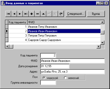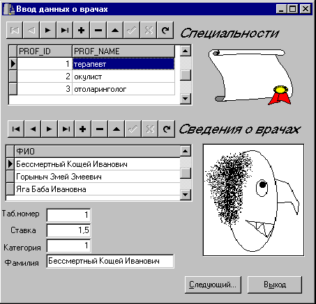 Создание автоматизированных рабочих местИтак, база данных создана. Теперь, наконец, можно заняться созданием автоматизированных рабочих мест. Сколько и каких автоматизированных рабочих мест должно быть создано, обычно решается на этапе проектирования данных. В данном простейшем случае очевидно, что работа по вводу данных в информационную систему подразделяется на три основных дочерних работы: ввод сведений о врачах поликлиники (это обычно делается в отделе кадров, и соответственно следует создать АРМ инспектора отдела кадров), ввод сведений о пациентах (рабочее место медрегистратора), ввод сведений о статистических талонах (рабочее место медстатистика). Помимо этого, кто-то должен осуществлять заполнение справочников "Цель посещения" и "Статус" (можно добавить эти функции в АРМ медстатистика, так как объем этих таблиц невелик). Что касается списка диагнозов, он может быть либо введен в базу данных кем-либо из персонала поликлиники, либо импортирован администратором базы данных из какого-либо другого формата, так как этот список основан на реально существующем и неоднократно опубликованном документе. В общем случае эти рабочие места могут представлять собой отдельные приложения, обращающиеся к определенным таблицам в базе данных, а различные пользователи информационной системы должны иметь соответствующие их служебным обязанностям права доступа к таблицам. Например, представляется разумным запретить медрегистратору и медстатистику вносить изменения в таблицы со списком врачей, а кадровику вносить изменения в списки пациентов. Если исходить из того, что медстатистиков, медрегистраторов и кадровиков может быть несколько, имеет смысл создать в базе данных соответствующие роли (если, конечно, создание ролей поддерживается выбранным сервером), и назначить каждому пользователю соответствующую роль. Руководствуясь этими соображениями, создадим три роли в базе данных с соответствующими правами доступа к таблицам и три автоматизированных рабочих места для инспектора отдела кадров, медрегистратора и медстатистика, возложив на последнего также обязанность корректировать список диагнозов. Первые два АРМ-а создать относительно несложно (одно из них предназначено для ввода данных в одну таблицу, другое - в две таблицы, связанные соотношением "один ко многим"). Для этой цели можно воспользоваться утилитой Database Form Wizard и затем внести небольшие изменения в сгенерированные формы и код, в частности, для обеспечения возможности не использовать мышь при массовом вводе данных, а также для установки фокуса ввода в первое поле формы при создании новой записи (в обработчике события OnNewRecord соответствующего компонента TTable). Кроме того, следует исключить возможность ввода пользователем значения поля PROF_ID в список врачей - в этом случае значение этого поля генерируется автоматически в соответствии со значением в выбранной строке списка специальностей, что исключает попытки создания некорректной записи уже на уровне клиентского приложения (рис. 7,8)