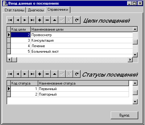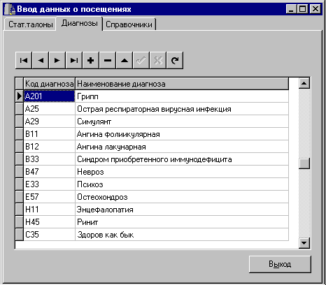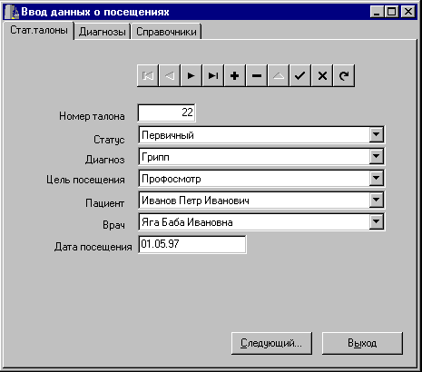 Рис.9. Автоматизированное рабочее место медстатистика - ввод справочных таблиц Используя серверную СУБД и сгенерировав базу данных с учетом правил ссылочной целостности в соответствии со схемой данных, представленной на рис.4, мы, конечно, можем быть уверены, что ввести в базу данных некорректные значения полей DOCT_ID, DIAG_ID, STAT_ID, PURP_ID, PAT_ID сервер пользователю не даст. Однако это вовсе не означает, что можно поместить на форму набор компонентов TDBEdit для ввода данных в эти поля. Такая реализация интерфейса приведет к совершенно неприемлемым условиям труда пользователя, вводящего данные - он должен помнить наизусть все табельные номера, номера карт и коды во вспомогательных таблицах и в случае ошибок сталкиваться с сообщениями, сгенерированными триггерами сервера. Более разумно использовать выбор нужного значения из списка, поэтому для ввода данных в эти поля поместим на форму компоненты TDBLookupCombBox и выберем в качестве значения ListSource источники данных, связанные с соответствующими словарными таблицами, в качестве значения КеуField - имена их первичных ключей, а в качестве ListField - имена полей, в которых хранятся соответствующие названия статусов, диагнозов, имена врачей и др. Теперь пользователь может выбирать значения полей DOCT_ID, DIAG_ID, STAT_ID, PURP_ID, PAT_ID из выпадающих списков, в которых содержатся не коды, а символьные строки (рис 10). Таким образом, мы избавились от необходимости непосредственного ввода пользователем значений внешних ключей, заменив его выбором из соответствующих списков.