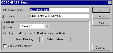 Рис.18. Описание ODBC-источника с помощью панели управления Windows Попробуем осуществить обратное проектирование с помощью ERwin , используя созданный ODBC-источник. Для этого из меню главного окна ERwin выберем опцию Tasks/Reverse Engineering . Первая проблема, с которой при этом можно столкнуться, заключается в том, что Erwin не поддерживает формат данных dBase 5.0 (с прежними версиями dBase такой проблемы нет), и при обратном проектировании структура таблиц, содержащих графические поля, не всегда восстанавливается. Обычно эта проблема решается путем выбора сходной по структуре платформы (dBase III, Clipper, FoxPro) и последующей коррекции результатов обратного проектирования. Особое внимание при этом следует обращать на специфические типы данных (например, BLOB-поля), так как различия между платформами заключаются, в частности, в способах хранения подобных типов данных (но, разумеется, не только в этом). Выберем в качестве исходной платформы Clipper, ответим на вопросы, предлагаемые в последующем диалоге (можно оставить то, что предложено по умолчанию) и в результате получим модель данных, похожую на изображенную на рис.19 (она содержит описание всех dBase-таблиц из каталога, содержащего данные для примеров, поставляемых с C++Builder):