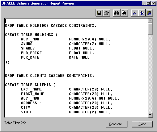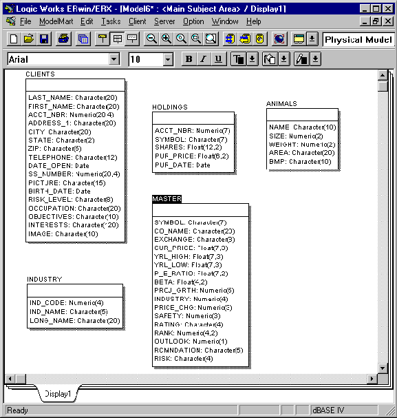 Рис.19. Результат обратного проектирования каталога CBUILDER\EXAMPLES\DATA Отредактируем полученную модель данных, убрав все таблицы, кроме CLIENTS и HOLDINGS, определив ACC_NBR первичный ключ таблицы CLIENTS и изменив тип данных поля IMAGE на МЕМО (опция Column Editor контекстного меню таблицы). Создадим также неидентифицирующую связь "один-ко-многим" между таблицами CLIENTS и HOLDINGS, выбрав для этой цели соответствующую пиктограмму на "плавающей" инструментальной панели. Далее следует выбрать другую целевую платформу (в нашем случае Oracle). В результате получим примерно следующий вид модели данных: