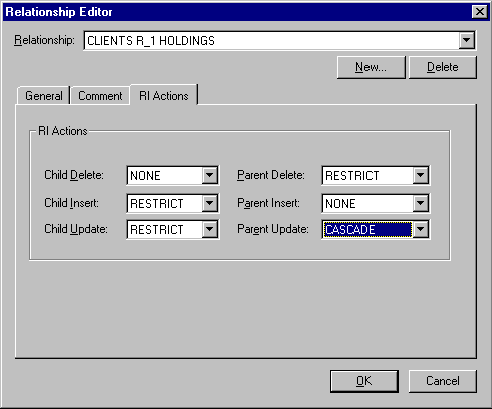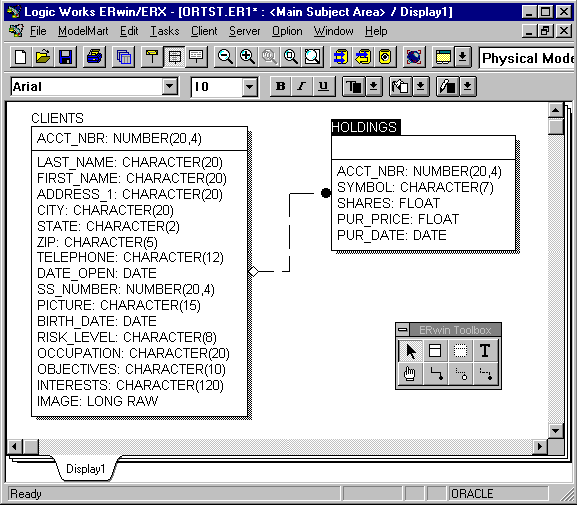 Рис.20. Примерный вид модели данных для генерации БД в Oracle Теперь можно описать свойства имеющейся связи между таблицами. Так как это связь "один-ко-многим", это следует явно указать в диалоге, вызываемом с помощью опции Relationship Editor контекстного меню связи. В том же диалоге на другой странице трехстраничного блокнота следует выбрать из предлагаемых выпадающих списков возможную реакцию сервера на попытки нарушения ссылочной целостности со стороны клиента. Например, при попытке удалить запись из таблицы CLIENTS можно либо совершить каскадное удаление (то есть удалить все соответствующие записи из таблицы HOLDINGS), либо запретить удаление, если имеются соответствующие записи в дочерней таблице, с выдачей диагностического сообщения.
