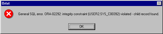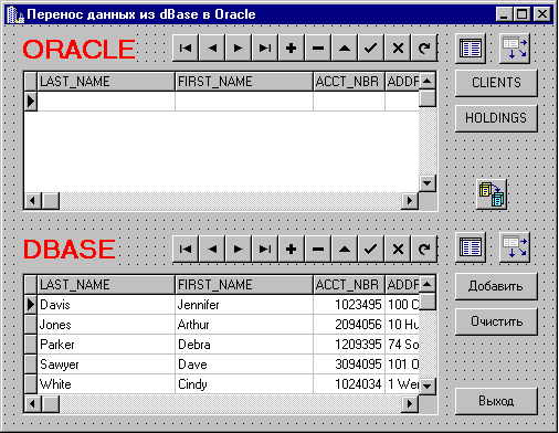 Скомпилируем и запустим приложение. Кнопки CLIENTS и HOLDINGS осуществляют выбор между той или иной парой таблиц. При нажатии кнопки Добавить происходит перенос данных из активной в данный момент таблицы dBase (CLIENTS или HOLDINGS) в соответствующую таблицу Oracle. Отметим, что наличие поддержки ссылочной целостности можно проверить, попытавшись перенести данные из таблицы HOLDINGS до того, как перенесены данные из таблицы CLIENTS. При этом перенос осуществлен не будет, и в процессе выполнения приложения появится диагностическое сообщение примерно следующего вида (рис.24):