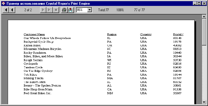 При нажатии на первую из кнопок производится выбор файла отчета с помощью стандартного диалога открытия файлов. При нажатии на вторую кнопку производится запуск Run-time-версии Crystal Reports и отображение отчета в стандартном окне (рис. 2):