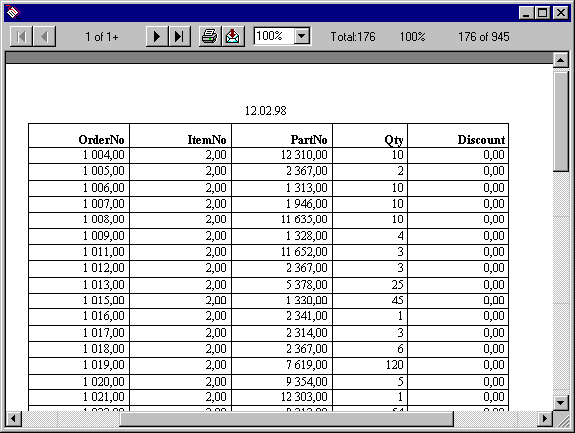 В результате нажатия пользователем на кнопку пользователь получает в окне отчета записи, в которых значение поля ItemNo равно введенному пользователем числу (то есть то же самое, что изображено на рис.4). Отметим, что Crystal Reports ActiveX можно с успехом использовать в приложениях, созданных с помощью любого другого средства разработки, использующего управляющие элементы ActiveX. Отметим также, что для пользователей Delphi 1.0 в комплекте поставки 16-разрядной версии Crystal Reports Professional имеется сходный по функциональности управляющий элемент VBX, который также может быть установлен в палитру компонентов и использован в 16-разрядных приложениях. Таким образом, на сегодняшний день существует довольно богатый выбор способов, с помощью которых можно управлять отчетами Crystal Reports из средств разработки - как с использованием вызовов функций Print Engine API, так и с использованием OLE-технологии. |