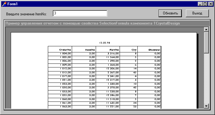 В этом обработчике события на основе значения, введенного пользователем в компонент TEdit, меняется значение свойства SelectionFormula компонента TCrpe, и в результате пользователь получает в окне отчета не всю таблицу целиком, а только записи, в которых значение поля ItemNo равно введенному пользователем числу (рис.4). Для работоспособности данного кода рекомендуется в качестве значения свойства SelectionFormula ввести хотя бы одну пустую строку, чтобы в соответствующем строковом массиве был хотя бы один элемент.