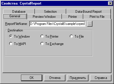 Рис.6. Пример использования Crystal Reports ActiveX Crystal Reports ActiveX обладает весьма удобным редактором свойств, позволяющим определить ряд опций уже готового отчета.