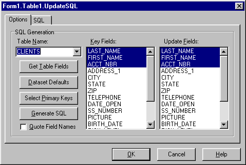 Cтандартные SQL-запросы для добавления, удаления и изменения записи наиболее удобно создавать с помощью UpdateSQL editor, выбранного из контекстного меню компонента UpdateSQL1 (рис. 10)
