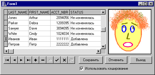 Если перед запуском приложения запустить утилиту SQL Monitor, то можно пронаблюдать, как генерируются запросы, содержащиеся в свойствах компонента UpdateSQL1, при использовании кэширования и без него, а также как отображается состояние конкретной записи при использовании кэширования (рис.11):