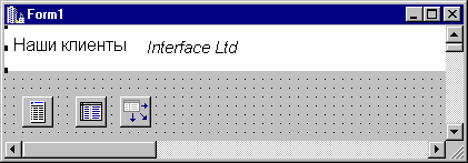 Рис. 1. Создание заголовка отчета Если нажать правую клавишу мыши над компонентом QuickReport1 и выбратьиз контекстного меню опцию Preview Report, появится окно просмотра, в которомбудет отображена страница отчета с созданным заголовком. Для модификации отчета следует изменить свойство BandType компонентаQRBand1 на rbDetail и добавить на форму компонент TTable. Далее нужно установитьего свойство DataBase равным имени псевдонима, например, BCDEMOS, свойствоTableName равным имени таблицы, например, CUSTOMER.DB, а затем свойствоActive равным true. После этого нужно добавить на форму компонент TDataSourceи установить его свойство DataSet равным имени добавленного ранее компонентаTable1, а затем установить свойство DataSource компонента QuickReport равнымимени созданного компонента DataSource1. После этого можно добавить компонентTQRDBText на QRBand1(этот компонент предназначен для вывода содержимогополей таблицы или запроса, служащего источником данных проектируемого отчета),установить свойство DataSource равным имени созданного ранее компонентаDataSource1 и выбрать нужное поле в качестве значения свойства DataField.Если есть необходимость, можно добавить другие компоненты TQRDBText и выбратьдругие поля таблицы для отображения в отчете (рис. 2).