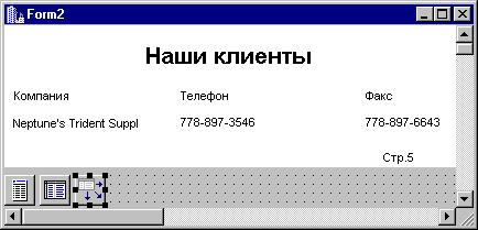 Рис. 2. Модификация табличного отчета Если теперь из контекстного меню компонента QuickReport выбрать опциюPreview Report, можно увидеть модифицированный табличный отчет. Теперь попробуем создать отчет с заголовком отчета и колонтитулами.Для этого нужно использовать при создании отчета несколько различных компонентовTQRBand. Для создания отчета с заголовком и колонтитулами следует cоздать новуюформу, разместить четыре компонента TQRBand на форме (они получат по умолчаниюимена QRBand2,...., QRBand5) и установить их свойства BandType равнымисоответственно rbTitle, rbColumnHeading, rbDetail и rbPageFooter. Далееследует добавить на форму компонент TTable и установить его свойство DatabaseNameравным BCDEMOS, свойство TableName равным Customer, а затем свойство Activeравным true. Затем нужно добавить на форму компонент TDataSource и установитьв его свойстве DataSet имя добавленного ранее компонента Table1 и установитьсвойство DataSource компонента QuickReport равным имени созданного компонентаDataSource1. Затем следует добавить несколько компонентов TQRLabel в качествезаголовка отчета и столбцов поверх соответствующих компонентов TQRBand,присвоив необходимые значения свойству Caption каждого из них. Затем следует разместить три компонента QRDBText на компонент QRBandсо свойством BandType, равным DetailBand и установить их свойства DataSourceравными DataSource1, а свойства DataField равными Company, Phone и Fax.Наконец, для отображения номера страницы нужно поместить компонент TQRSysData(этот компонент предназначен для вывода сведений, не зависящих от содержимогоданных, таких как номер страницы, дата, время и др.) на компонент TQRBandсо свойством BandType, равным rbPageFooter и установить его свойство Dataравным qrcPageNumber, а свойство Text равным “Стр. “ После этого форма будет выглядеть, как на рис. 3. Можно снова выбрать опцию Preview Report и просмотреть содержание новогоотчета.