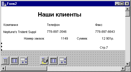 Рис.3. Отчет с заголовком и колонтитулами Создание отчетов "master-detail"Преобразуем созданный отчет в отчет "master-detail". Для этогоследует добавить компонент TTable, установить его свойство DatabaseNameравным BCDEMOS, свойство TableName равным ORDERS.DB, а затем установитьсвойство Active равным true. После этого установим свойство MasterSourceравным DataSource1. Затем выберем свойство MasterFields, вызвав диалоговуюпанель для установки связи master/detail (рис. 4 ) и из списка доступныхиндексов выберем CustNo. Затем выделим имя поля CustNo в обоих спискахполей и нажмем кнопку Add, а кнопку OK.