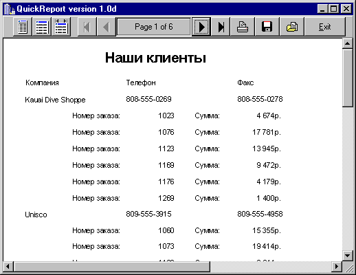Рис. 6. Отчет "master-detail". Отметим, что если компонент QuickReport не связан с компонентом DataSource,то при печати отчета выводится только одна запись из набора данных, чтолегко позволяет печатать текущую запись. Отображение графических и мемо-полейв отчетахQuickReport позволяет создавать отчеты с использованием любых типовданных. Если вместо определения DataSource создать обработчик события OnNeedData,можно с помощью QuickReport напечатать любые данные, меняя свойства компонентовTQRLabel, что во многих случаях используется для печати произвольной информации(иногда не имеющей отношения к базам данных). QuickReport не имеет собственного компонента для отображения графическихполей. Вместо этого можно использовать стандартные компоненты Timage илиTDBImage (рис. 7).