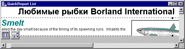 Рис. 7. Использование TDBImage для отображения графических полей Следует отметить, что графические поля баз данных может печатать далеконе всякий профессиональный генератор отчетов. Например, ReportSmith, входившийв комплект поставки ряда продуктов Borland, может печатать графическиеизображения, не имеющие непосредственного отношения к данным (например,взятые из файлов формата *.bmp), но отнюдь не графические поля таблиц. Для отображения мемо-полей можно использовать компонент TQRDBText. Еслисодержимое мемо-поля, отображаемого с помощью этого компонента, не умещаетсяв одну строку, высота этого компонента (и высота содержащего его компонентаTQRBand) в режиме предварительного просмотра и при печати отчета увеличиваетсятаким образом, чтобы внутри компонента TQRDBText уместилось все содержимоеmemo-поля. Чтобы избежать наложения получившегося текста на другие элементыотчета при его печати, можно просто размещать компоненты TQRDBText, отображающиеmemo-поля, в нижней части TQRBand (рис 7).