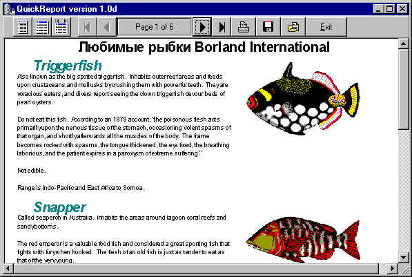 Рис. 8. А вот так выглядят memo-поля в отчете Если таких memo-полей несколько и они должны быть размещены друг поддругом, можно использовать несколько компонентов TQRBand одного типа дляодной записи. В этом случае печататься они будут в порядке их создания. Предварительный просмотр отчетовВ некоторых случаях требуется предварительный просмотр отчетов на этапевыполнения. Для этой цели используется метод Preview() компонента TQuickReport.При его выполнении на экране появится стандартная форма просмотра, изображеннаяна рис. 8. Если внешний вид стандартной формы просмотра по какой-либо причине васне устраивает, можно создать свою форму предварительного просмотра с помощьюкомпонента QRPreview. Этот компонент обладает свойствами PageNumber и Zoom,которые можно использовать для просмотра произвольной страницы отчета впроизвольном масштабе. Для создания собственного окна предварительного просмотра следует навновь созданной форме разместить компонент QRPreview и набор элементовуправления (например, кнопок) для перемещения между страницами, изменениямасштаба, печати и др. Далее следует написать код, аналогичный приведенному ниже примеру: