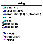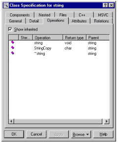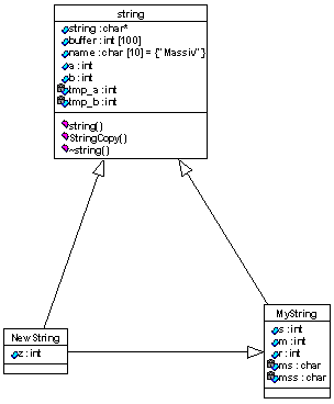 Рис.7 Рисунок 6 показывает модель класса "string". А на рисунке 7 отображается вкладка, описывающая функции класса. Как и в случае с переменными имена функций отображаются на экране. Также доступен вход в спецификации конкретной функции. Если еще раз вернуться к листингу, то можно обратить внимание на декларацию функции "StringCopy", в которой входные параметры дотошно документированы. Так вот, если был применен подобный подход к документированию, то комментарий каждого параметра перенесется в качестве описательного комментария в соответствующую часть атрибута модели класса. То есть, получается, очень выгодно подвергать обработке исходные тексты написанные по всем правилам программирования. С простым классом все просто - со сложным - немного сложнее. Ниже вашему вниманию представлен листинг трех классов и их визуальная модель. Пример иллюстрирует изобразительные возможности Rose в плане прорисовки связей между классами.