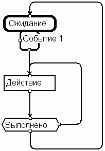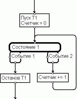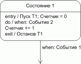 Вернемся к Рисунку 1, и рассмотрим его в терминах изложенного метода. Фактически, содержимое блока Состояние 1 представляет собой некоторый алгоритм, управляемый событиями. В нашей системе обозначений изображенное на Рисунке 1 состояние будет выглядеть следующим образом: