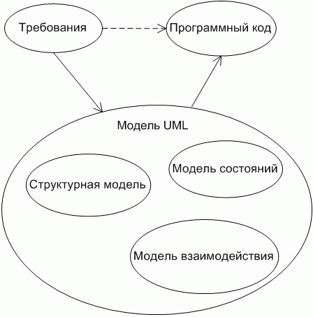 Разработка программных систем представляет собой некоторое количество отображений, то есть создание ряда представлений проектируемой системы на основании разработанных ранее других представлений. Например, разработка программного кода - это отображение сформулированных ранее требований к системе, либо созданных ранее диаграмм, моделей, в упорядоченное множество операторов языка программирования. При прямом программировании выполняется отображение требований к системе в программный код (Рисунок 2). В случае использования CASE-средства выполняется несколько отображений. Например, в UML выполняются такие отображения: требования - диаграммы взаимодействия, требования - диаграммы состояний, требования - структурные диаграммы, и т.д. (Рисунок 3).