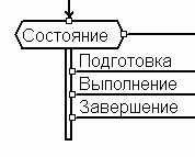 Находясь в некотором состоянии, объект может реагировать на события посредством принадлежащих этому состоянию реакций. По сути, реакция также конечно-автоматного происхождения, но в нашем методе ее смысл несколько отличается от автоматных понятий: она является следствием наступления конкретного события. В схеме может быть несколько реакций на одно и то же событие, но одному состоянию может принадлежать только одна реакция на это событие. Имя реакции совпадает с именем инициирующего ее события, поскольку в нашем представлении они тождественны. Реакция всегда принадлежит конкретному состоянию, и является единственным возможным путем выхода объекта из него.. Она изображается квадратом со скошенными углами, выполненным жирной линией, и примыкающим непосредственно к нижней грани состояния-владельца (Рисунок 5).