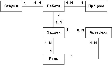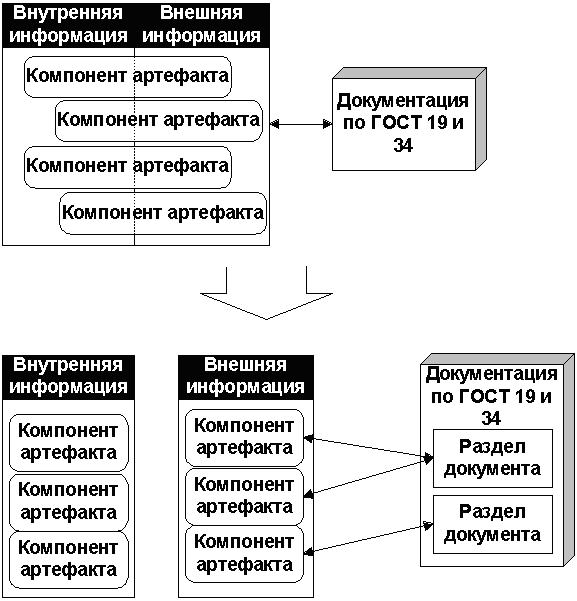 С учетом установленного соответствия стадий, для каждой стадии были выделены группы артефактов RUP, на основании которых могут автоматически генерироваться документы ГОСТ19 и 34. Необходимо отметить, что понятие “артефакт” включает не только документы, но и другие проектные материалы, создаваемые в ходе выполнения проекта. Например, модели, исходные коды, тестовые скрипты и т.п. Далее после выделения групп артефактов и соответствующих им документов ГОСТ, проводится сравнительный анализ их структуры. Дело в том, что нельзя ожидать точного соответствия какого-либо артефакта RUP документу ГОСТ, а это значит, что для создания одного документа ГОСТ обычно требуется информация, содержащаяся в нескольких разных артефактах RUP. Для установления четкого однозначного соответствия между артефактами RUP и документами ГОСТ необходимо “опуститься” на уровень отдельных разделов документов и компонентов артефактов. Понятие “компонент” используется для артефакта вместо понятия “раздел” по той причине, что, как было показано ранее, не все артефакты являются документами и говорить о “разделе” применительно к модели нельзя. Поэтому в каждом артефакте выделяются компоненты, а в документах используются разделы, соответствующие требованиям ГОСТ (см. рисунок 2). Рисунок 2 - Взаимосвязь артефактов RUP и документов ГОСТ В сравнении участвуют только те артефакты RUP, которые создаются в ходе для конкретного проекта (их перечень определяется при планировании), и действует правило сопоставления по стадиям – документы ГОСТ 19 и 34 или их разделы, формирующиеся на определенной стадии, сопоставляются с артефактами RUP, которые создаются на той же стадии. В качестве примера можно привести перечень основных документов по ГОСТ 19, обычно используемых в проектах и наиболее часто используемых артефактов RUP (см. таблицу 2). Таблица 2 - Основные документы ГОСТ 19 и артефакты RUP