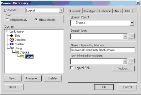 Как гласит реляционная теория, домен является областью определения значений атрибута. Однако, несмотря на то, что некоторые производители СУБД заявляют о полной поддержке реляционного подхода в своих продуктах, на самом деле все положения этого подхода не реализованы ни в одной коммерческой СУБД, да и вряд ли когда будут реализованы полностью. Одним из таких нереализованных моментов является понятие домена - в современных СУБД оно подменено понятием типа данных, что является довольно примитивным решением. В ERwin DM тоже существует понятие домена и его можно представить шаблоном атрибута, обладающим набором свойств, в числе которых тип данных, значение по умолчанию, правило проверки и некоторые другие. В процессе работы рекомендуется использовать именно домены, и только потом создавать атрибуты, принадлежащие конкретному домену. Такой подход не лишен определенной гибкости и позволяет более эффективно редактировать схему данных. Действительно, гораздо удобней создать домен ИД, присвоить ему набор свойств и только потом создавать атрибуты на основе данного домена. В случае изменения, к примеру, длины поля домена ИД, гораздо проще исправить данные этого домена - и все входящие в него атрибуты автоматически будут изменены. Использование макрокоманд в доменах является простейшим примером применения макрокоманд в ERwin DM.