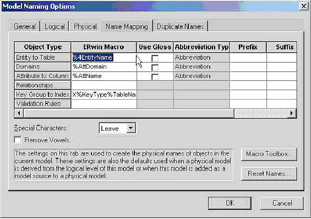Рис. 2. Пример использования макрокоманд в редакторе именования объектов модели. В приведенном примере используется макрокоманда вида %4EntityName, которая указывает на то, что таблица на физическом уровне представления будет иметь имя соответствующей сущности, ограниченное четырьмя первыми символами. Выше были рассмотрены наиболее простые примеры использования языка макрокоманд ERwin DM. Перед тем, как рассмотреть более сложные примеры, познакомимся чуть ближе с самим языком макрокоманд. Язык макрокоманд состоит из 195 команд. В ERwin DM включена специальная панель инструментов - Macro Toolbox для работы с макрокомандами. С помощью данной панели можно выбрать нужную макрокоманду из списка, просмотреть синтаксис выбранной макрокоманды и получить справку по ее использованию.