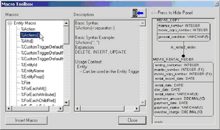 Рис. 3. Панель инструментов Marco Toolbox. Рассмотрим синтаксис одной из макрокоманд ERwin DM. %ForEachColumn(<table>,<separator>,<sort order>) { <macro code> } Фраза %ForEachColumn является названием макрокоманды. Все фразы, заключенные в кавычки (<>), являются переменными макрокоманды, скобки и запятые указывают на необходимый синтаксис. %ForEachColumn(cust,","){%ColName} - в результате действия этой макрокоманды будет выведен список столбцов таблицы cust. Действия, выполняемые при помощи языка макрокоманд ERwin DM подобны действиям, выполняемым в других языках программирования, и включают в себя: