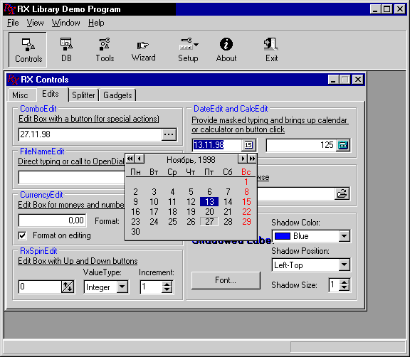 Помимо рассмотренных визуальных компонентов для отображения данных, библиотека содержит также разнообразные поля редактирования, в некоторых случаях аналогичные компонентам со страницы RX Controls (TRxDBCalcEdit, TDBDateEdit и др.)