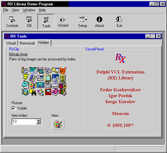 Библиотека компонентов Delphi VCL Extensions (RX) Library, разработанная Федором Кожевниковым, Сергеем Королевым и Игорем Павлюком, представляет собой бесплатный свободно распространяемый (freeware) продукт, пользующийся заслуженной популярностью в течение трех лет как в нашей стране, так и за рубежом. По мнению наиболее квалифицированных разработчиков, анализировавших исходные тексты RX Library, компоненты и классы этой библиотеки практически не содержат ошибок.