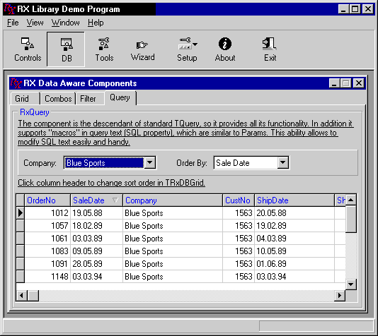 Рис.10. Пример использования компонента TRxQuery: на этапе выполнения можно изменить порядок сортировки и условия отбора записей