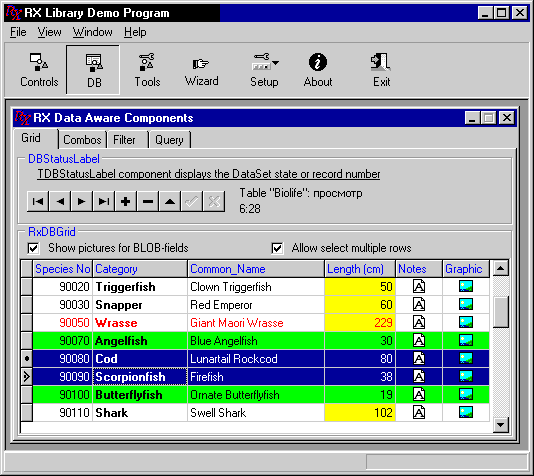 Из визуальных компонентов следует отметить компонент TRxDBGrid - наследник TDBGrid, позволяющий отображать BLOB-поля базы данных в виде пиктограмм, изменить цвет шрифта и фона любой ячейки таблицы (либо любой ее строки или столбца) в зависимости от значения поля или имени поля набора данных, сохранять и восстанавливать порядок и ширину столбцов в INI-файле или в реестре, а также выбирать несколько записей. Заголовки колонок этого компонента могут быть с помощью использованы как кнопки, например, для изменения порядка сортировки отображаемых данных. Можно также зафиксировать в компоненте TRxDBGrid несколько первых колонок (рис. 12).