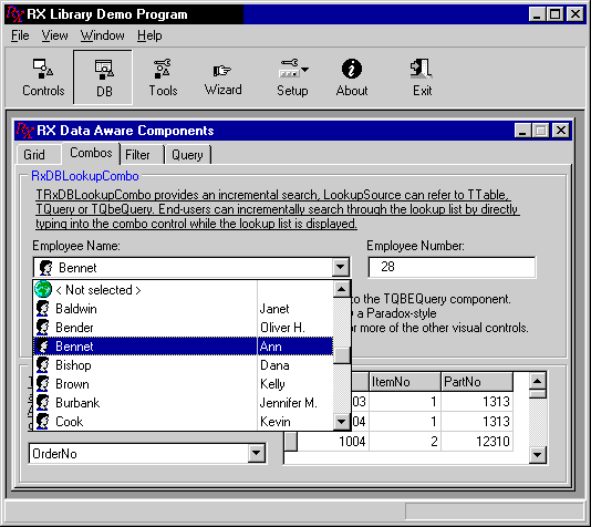 Рис.13. Пример использования компонентов TDBIndexCombo и TRxDBLookupCombo