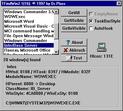 Рис. 9. Пример использования TCoolTrayIcon TFindWin, ver. 2.1 Torry\vcl\system\finwin16.zip, findwin.zip Этот компонент позволяет получить информацию о запущенных приложениях и открытых окнах.