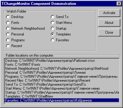 Рис. 10. Пример использования TFindWin TChangeMonitor, ver. 1.1Torry\vcl\system\chng.zip Компонент позволяет следить за системными папками Windows, такими как Desktop, Fonts, Network Neighborhood, Personal, Programs, Recent Documents, Send To, Start Menu, Startup, Templates, Favorites и уведомлять пользователя о произошедших в них изменениях (создании или переименовании содержащихся в них файлах, создании каталогов, изменении атрибутов файлов, модификации файлов и др.).