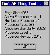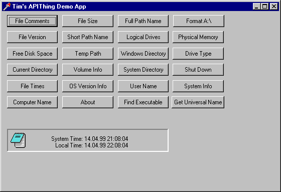 TtvAPIThing 4.0Torry\vcl\system\apithing.zip Разработчик - Tim Victor (tvictor@erols.com) TtvAPIThing - компонент, содержащий вызовы различных функций Windows API для получения информации об операционной системе, характеристиках компьютера, файловой системе, внешних устройствах, именах системных каталогов и пр. Содержит пример, демонстрирующий использование компонента.