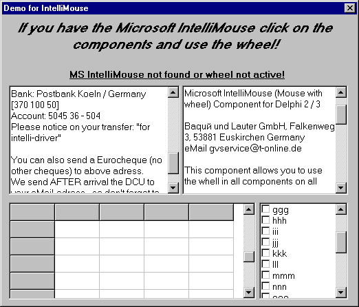 Рис. 6. Пример использования Microsoft IntelliMouse Component (все представленные интерфейсные элементы действительно работают с Intellimouse). TWheelMouse v1.11Torry\vcl\system\wheelms.zip Еще один компонент для поддержки Intellimouse в Delphi 2 и Delphi 3. Позволяет выбирать, какие из компонентов, содержащих полосы прокрутки, поддерживают Intellimouse, а также менять скорость перемещения текста при вращении колеса. Рис. 7. Пример использования TWheelMouse (все представленные интерфейсные элементы действительно работают с Intellimouse). TProgmanhttp://www.torry.ru/vcl/system/progman.zip Разработчик - Andrew McLean, AEROSOFT (Sydney, Australia) Компонент предназначен для создания программных групп и ярлыков приложений.