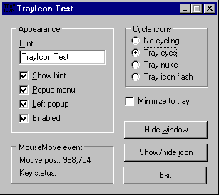 Рис. 8. Пример использования TProgman TCoolTrayIcon, ver. 2.1.1http://www.torry.ru/vcl/system/trayicon.zip Этот компонент предназначен для помещения пиктограммы работающего приложения в правой части панели задач (tray). Позволяет добавить к пиктограмме меню, скрывать пиктограмму, использовать анимацию в пиктограмме и др.