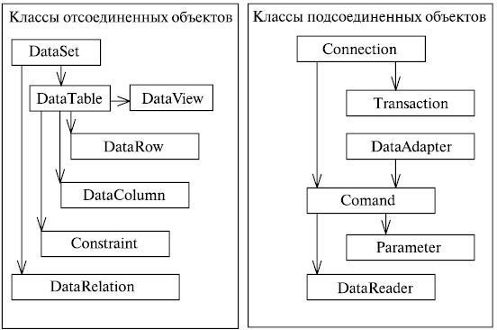 Объектная модель ADO .NET предполагает существование (при написании приложения для работы с базой данных — использование) двух множеств классов, выполняющих четко определенные задачи при работе с базой данных: