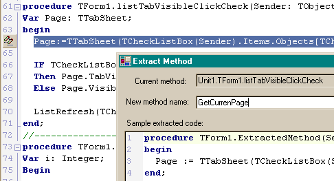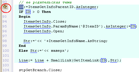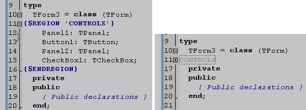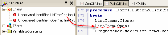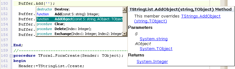 В новой IDE это делается легким движением руки. Выделяем текст, нажимаем клавиши [Ctrl+/] и весь выделенный код оказался закомментирован. Обратная операция делается точно так же. На всякий случай напомню, почему это лучше, чем обычные скобки {} в начале и конце куска кода. В случае использования в начале каждой строки двойного слеша нет никакой нужды заботиться о вложенных комментариях, которые могут уже быть в выделенном тексте. Этот способ "устранения" части кода бывает удобен при отладке. Очень удобна новая возможность редактора показывать соответствующие пары скобок (см. рисунок). Сворачивание части кодаКак и в Delphi8, в редакторе Delphi2005 реализовано частичное скрытие (сворачивание кода). Это позволяет работать с большими текстами, не прокручивая многостраничный экран. Достаточно оставить развернутым сейчас только тот код, который используется. Для того чтобы свернуть или развернуть нужный блок, специально предусмотрены значки [-] и [+] в левой части редактора. Если нажать на значок [-], например, возле определения метода, код этого метода будет свернут, то есть, убран из видимости. Но, кроме этого, есть возможность применить эту операцию ко всему коду, а не только к текущему месту. В меню по правой кнопке мыши есть два пункта Fold и UnFold. Это, соответственно, операции "свернуть" и "развернуть". Для каждой из них нужно указать место действия. Например, свернуть все методы в коде или все определения типов. Хочется заметить, что "свернутая" часть кода никуда не девается, а лишь уходит из видимой части редактора. Так что, если при компиляции или во время работы "Error Insight", ошибка окажется в свернутом коде, он прекрасным образом будет развернут автоматически в нужном месте. Так что никакой путаницы не возникнет. Кроме этих возможностей, введены две директивы, которые по синтаксису аналогичны директивам компилятора, но оказывают влияние на поведение редактора, а не на генерируемый код. Это директивы $REGION и $ENDREGION. Они задают начало и конец сворачиваемого региона кода. Можно задать имя региона, в этом случае, когда регион свернут, вместо многоточия отображается имя региона (см. рис). Help InsightЕсли в привычном "Code Insight" показывался тип идентификатора (переменной, функции и т.д.) и модуль, в котором он определен, то "Help Insight" представляет собой всплывающее окно-подсказку, с кратким описанием этого идентификатора и дополнительными ссылками (см. рис). Достаточно подвести мышку к нужному идентификатору, чтобы получить такой "маленький help". Использовать "Help Insight" можно в комбинации с "Code Completion". Если в окне "Code Completion" выбрать определенное свойство или метод, то справа появится окно с подсказкой. Открыть скриншот в отдельном окнеЭта возможность реализована не только для стандартных, но и для собственных классов и переменных. Использование "Help Insight" включено по умолчанию. Местонахождение в настройках: Tools->Options->Editor Options->Code Insight Error InsightВ левой части экрана есть окно "Structure". Оно используется для показа визуальных компонент, лежащих на форме, переменных и констант, списка модулей, которые подключены и так далее. Но, кроме этого окно "Structure" может показывать список синтаксических ошибок, которые определяются до момента компиляции с помощью "Error Insight". Например, самая обычная ошибка — неверно написан идентификатор или не подключен модуль, в котором он определен. Если раньше, до момент