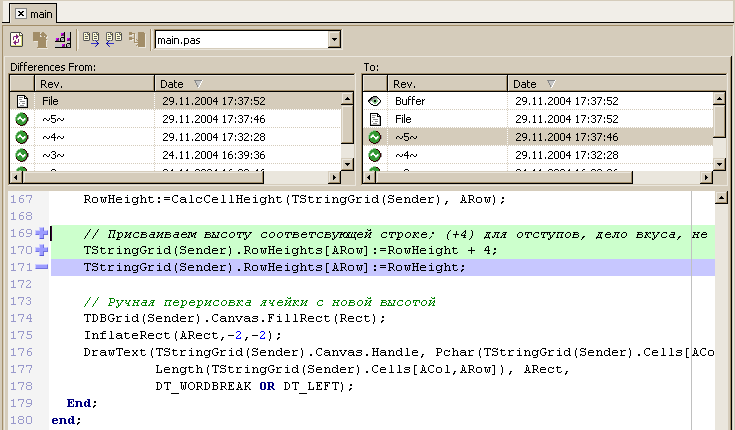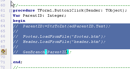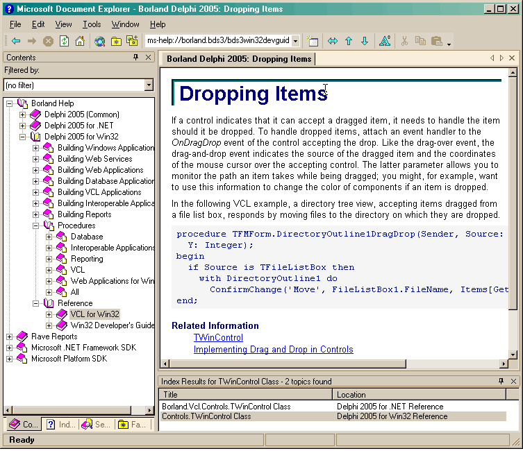 Первая страницаПосле загрузки среды перед нами возникает приветственная страница "Welcome Page". Это новый аналог того самого окошка новостей, которое выглядело довольно неказисто, если ваш компьютер не был подключен к интернету во время работы. Однако не стоит так же сбрасывать со счетов и новый вариант. Кроме ленты новостей (RSS), "Welcome Page" содержит немало полезных ссылок. Во-первых, в самом верху страницы перечислен список проектов, которые вы уже открывали некоторое время назад, с указанием даты последней модификации. Каждая ссылка, естественно, открывает выбранный проект. Показать скриншот в отдельном окнеВ левой части страницы подобраны ссылки на справочную информацию, документацию, которая устанавливается на ваш компьютер при инсталяции Delphi2005. Далее идут ссылки в интернет, на страницы компаний-разработчиков, чьи продукты встроены в среду. Например, на страницу Rave Reports, IntraWeb и так далее. И, наконец, ссылки на новостные группы в интернете, BDN и другие страницы Borland-ресурсов. То есть, "Welcome Page", действительно содержит полезную информацию. Может быть, не часто придется ею пользоваться, но и забывать о ней не стоит, может пригодиться. Среда предоставляет возможнсть работать как в классическом стиле предыдущих версий Delphi (с отдельными окнами для дизайнера форм, инспектора объектов и т.д.), так и в стиле, максимально приближенном к MS Visual Studio, когда все окна пристыковываются к центральному, в котором можно заниматься дизайном формы или редактированием кода. Для того, чтобы привести окна редактирования и палитры компонентов к привычному виду, поэкспериментируйте с настройками Tools | Environment Options | Delphi Options | VCL Designer | Embedded designer и Tools | Environment Options | Tool Pallete. В Delphi2005 изменилась справочная система. Изменился не только внешний вид, но внутренняя структура предлагаемой информации. На мой взгляд, пользоваться справкой стало намного удобнее. Показать скриншот в отдельном окнеПоявилась возможность настраивать цвета для Object Inspector, смотрите Редактор кодаС редактором кода стало работать намного удобнее. Комментирование блока текстаНачнем с одной приятной мелочи. Не знаю, как кому, но мне ее иногда очень не хватало в Delphi. Я имею в виду возможность быстро закомментировать или раскомментировать блок текста в редакторе.