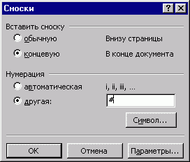 диалоговом окне (рис.1) выбираем вид сноски - "концевая", нумерация - "другая", в окошке для ввода символа пишем "#" (без кавычек, понятное дело). Нажимаем ОК, ссылка добавлена и каретка