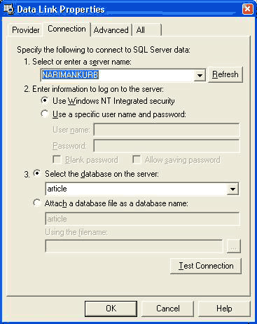 Настройка компонентов: ADOConnection1.LoginPrompt := False; DataSource1.DataSet := ADOStoredProc1; DataSource2.DataSet := ADOStoredProc2; DataSource3.DataSet := ADOQuery1; Form2.DBGrid1.DataSource := DataModule1.DataSource2;Первая (главная) форма должна использовать (uses) DataModule и Form2 Вторая (форма отчёта) форма должна использовать (uses) DataModule "Каркас" нашего приложения готов! Самая первая задача, это соединиться с сервером из нашего приложения. Для этого нам понадобиться файл с расширением ".udl", назовём его "Connect.udl". (Создайте файл в директории с исходным кодом). При запуске этого файла должно появиться окно: