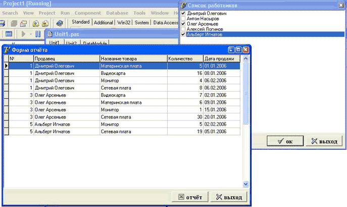 С созданием и заполнением таблиц на сервере закончили. Приступим к разработке клиентской части. Клиентское приложение будет иметь две формы и один DataModule.Положим на главную (первую) форму список (TCheckListBox), в котором будут выбираться продавцы. Теперь добавим новую форму (форма для показа отчёта) в проект, и положим на неё сетку (TDBGrid), в которую будут выводиться результаты выборки. Так же создадим DataModule1: TDataModule и положим на него следующие компоненты: ADOConnection1: TADOConnection;