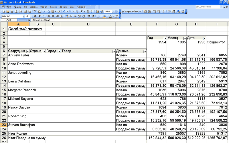 Создание сводного отчета в ExcelВладимир Федченко, Королевство Delphi В списке обсуждаемых тем на Круглом столе Королевства Delphi часто возникает вопрос о построении сводных таблиц. Сводная таблица представляет собой очень удобный инструмент для отображения и анализа данных, возвращаемых запросом к базе данных. Можно, конечно, для этой цели использовать различные пакеты для построения отчетов (вроде FastReport). Но с генераторами отчетов возникает масса вопросов (отсутствие каких либо библиотек, проблемы с экспортом, отсутствие необходимой документации и т.д.). А начальник требует выдать ему отчет приблизительно такого вида: чтобы были видны все продажи, по всем сотрудникам, по всем регионам, по всем товарам за указанный период времени (скажем, за два года), но денег на покупку генератора отчетов не дает. А как бы было хорошо выдать что-нибудь типа вот такой формы: ![]() Что тут остается делать. Варианта только два: либо пытаться создавать что-то свое, либо увольняться. Альтернативное решение проблемы предоставлено фирмой Microsoft уже очень давно. Называется оно PivotTable (Сводная таблица) и доступно в меню "Данные" приложения Excel. Осталось только научиться пользоваться этой возможностью. Для этого нам понадобиться: