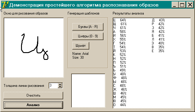 Шаг 3. Распознавание рисованных (от руки) символов. Распознавание осуществляем путем сравнения матрицы 16х16 распознаваемого символа с матрицей эталона (путем перебора имеющихся в наличии). Сравнение производим поэлементно при помощи оператора XOR. Результат - матрица 16х16, содержащая единицы в местах несовпадений тест-символа и эталона. Путем подсчета количества несовпадений формируем вектор, содержащий эту информацию для каждого эталонного символа, и производим сортировку эго элементов по возрастанию количества несовпадений. Параметр (1 - Result[i]/256)*100%, где Result[i] - кол-во несовпадений для i - го символа, показывает "вероятность" соответствия образа конкретному символу. Демонстрационная программа. Пример работы демонстрационной программы