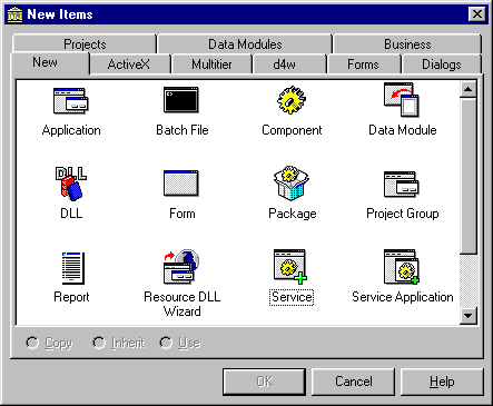 Поддержка сервисов Windows NTВ Delphi 4 имеется поддержка приложений-сервисов Windows NT, выполняющихся в фоновом режиме и стартующих при загрузке операционной системы. С этой целью в репозитарии объектов имеются два дополнительных шаблона для создания подобных приложений.