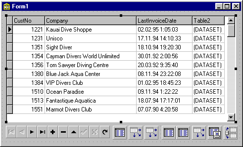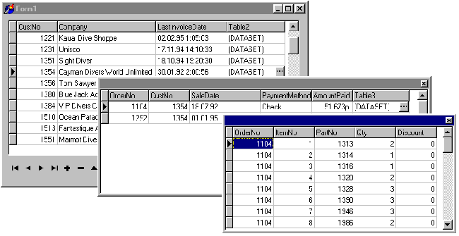 Работа с базами данныхПри использовании компонента TTable можно создавать, переименовывать и удалять таблицы непосредственно в дизайнере форм - в контекстном меню этого компонента есть соответствующие команды. Поддержка новых версий СУБД и новых типов данныхБиблиотека Borland Database Engine (BDE) теперь поддерживает Access '97 и Oracle8, при этом поддерживаются новые расширения Oracle 8, такие как абстрактные типы данных (ADT - Abstract Data Type), массивы, ссылки, вложенные таблицы. В соответствии с этим созданы новые классы объектов - потомков TField: TADTField, TReferenceField, TDataSetField, TArrayField. Поддержка вложенных таблицКомпонент TDBGrid теперь может отображать вложенные таблицы. Для иллюстрации этой возможности воспольуемся таблицами customer.db, orders.db и items.db, поставляемыми вместе с Delphi. Поместим на форму три компонента TTable, три компонента TDataSourse, один компонент TClientDataSet и один компонент TProvider. Установим следующие свойства этих компонентов: